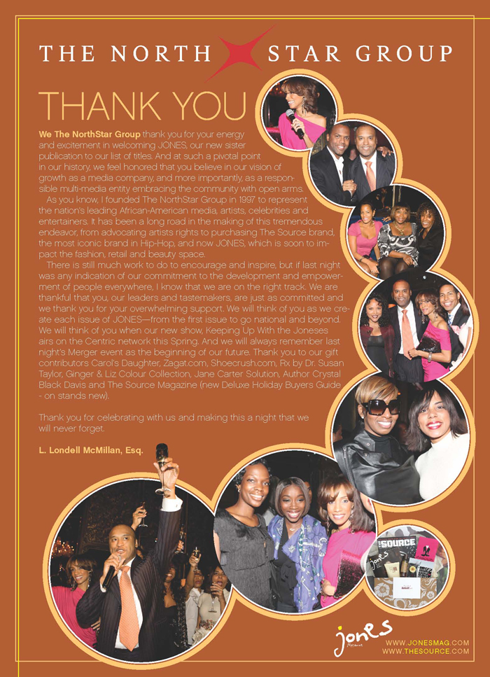 Please note that, as a contributor to the event gift bags, you will receive thank you credits in the show "Keeping Up With The Joneses" (airing 2010 on Centric), as well as the in-book recap in February issue of Jones Magazine, and mention in the attached Thank You note from The NorthStar Group that will be serviced to all who were invited, all who attended, bloggers, publicists and media.